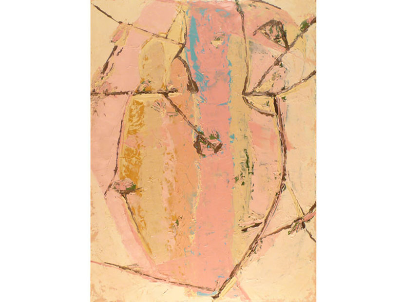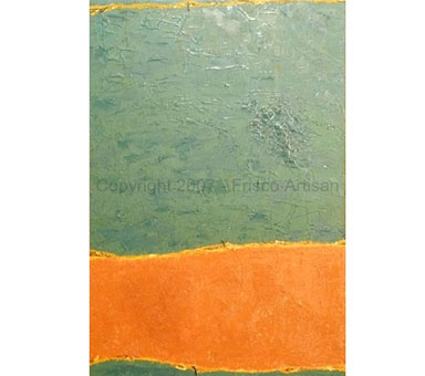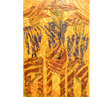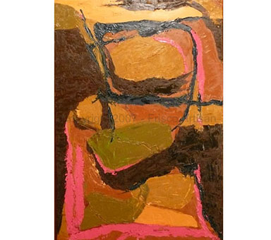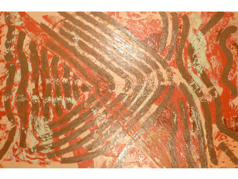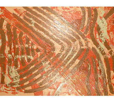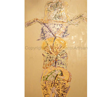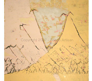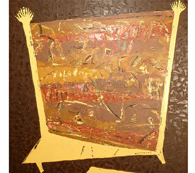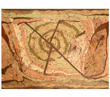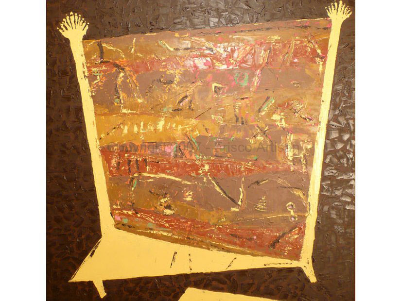 Oil Over Acrylic on Canvas - size- 48" x 70" Date: 2007 Description: Canvas with fabric and raised areas, mask - like image of tribal fossil elements