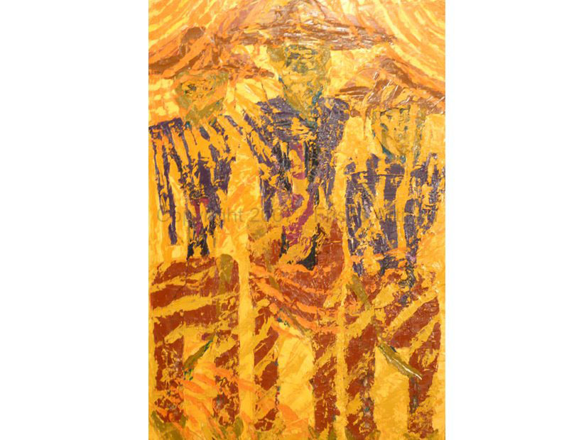 Oil on Canvas - size- 48" x 48" Date: 2007 Description: Mountians with teathered birds and Deity